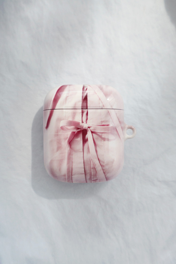 분홍색 리본 블라우스를 촬영하여 제작한 에어팟 케이스입니다.